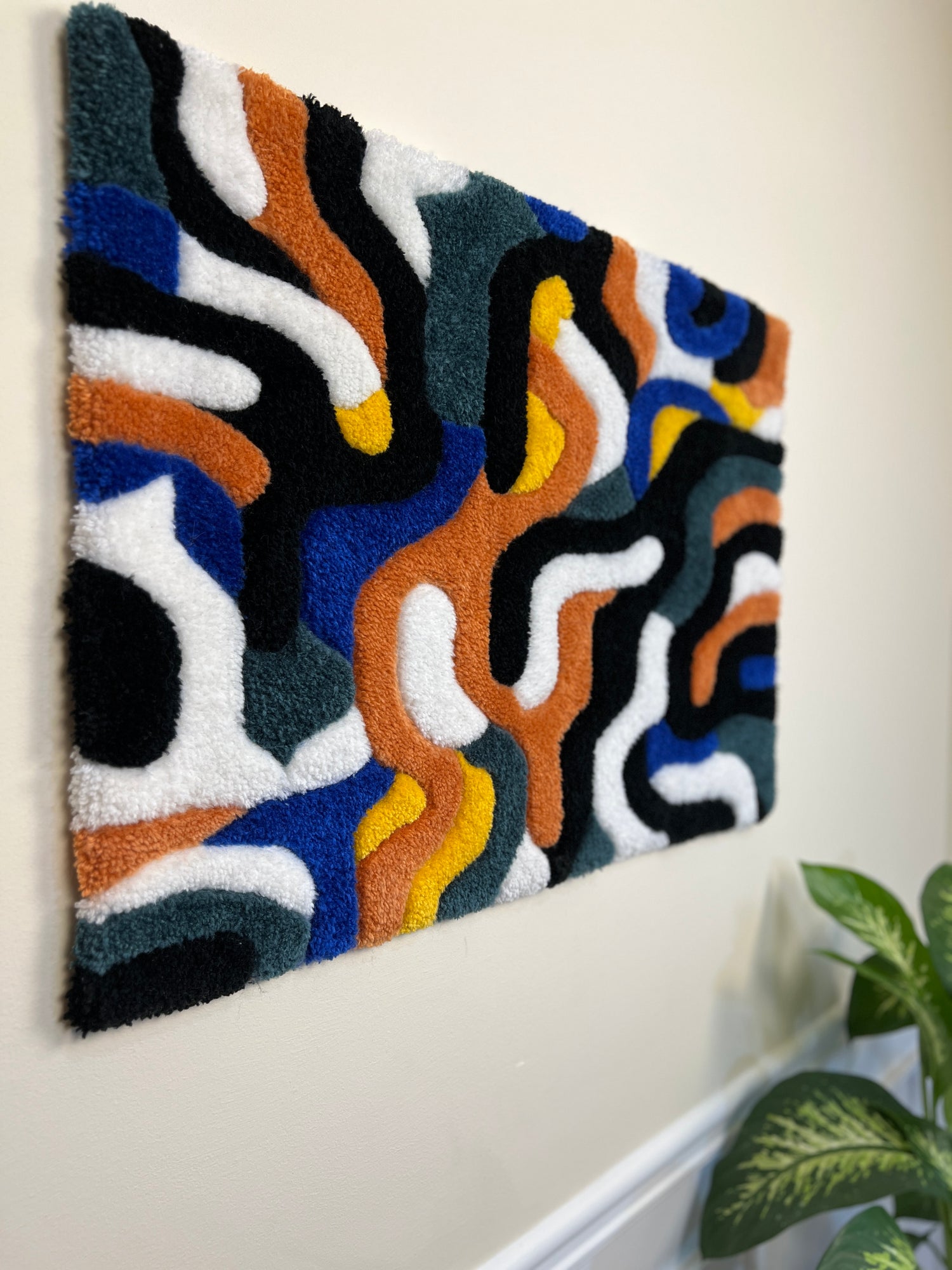 Elevate your space with our unique 34" x 23" abstract art piece, handmade with meticulous care. Versatile as a rug or wall hanging, this one-of-a-kind creation is truly exclusive—limited to just 1. Make a statement with a piece that blends functionality with aesthetics, showcasing the beauty of handmade craftsmanship.